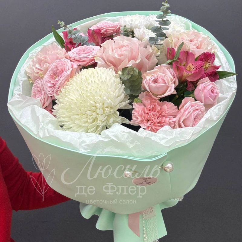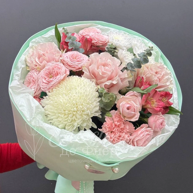 Букет из розовых и белых цветов, элегантно собранных в гармоничную композицию. Нежные оттенки роз, пионовидных кустовых роз и хризантем создают атмосферу легкости и утонченности. Этот букет станет прекрасным подарком для тех, кто ценит красоту и изящество.
