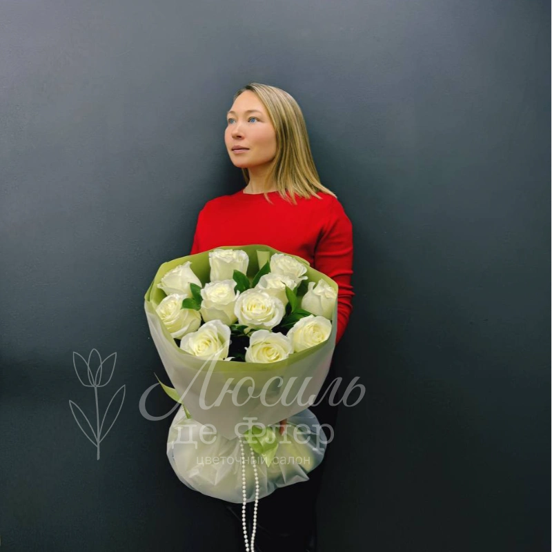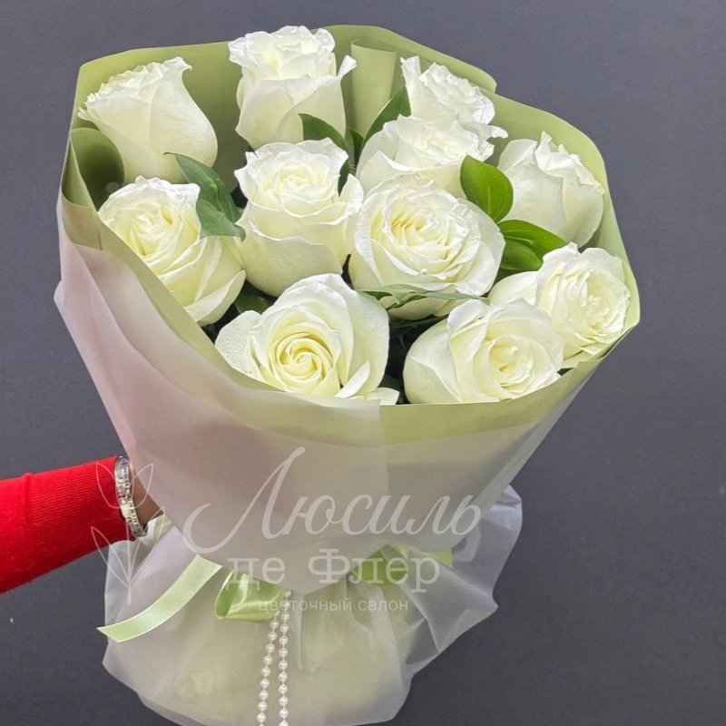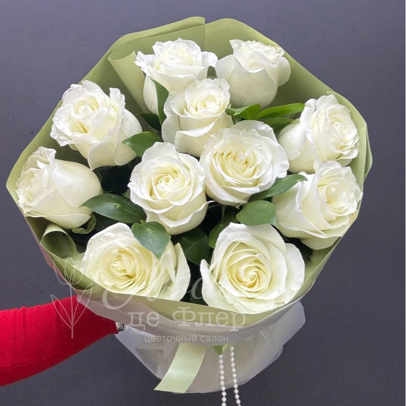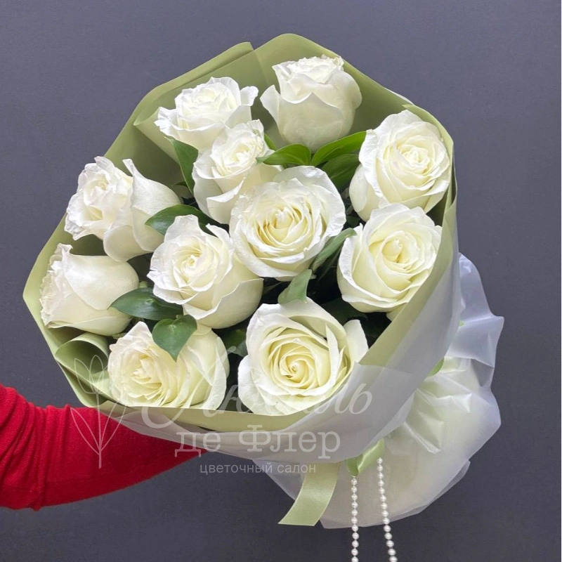 Букет из одиннадцати белых роз, элегантно упакованных в светлую зелёную бумагу и дополненных воздушной белой лентой, создаёт ощущение нежности и чистоты. Этот букет идеально подойдёт для выражения искренних чувств и станет прекрасным подарком на любой торжественный повод.