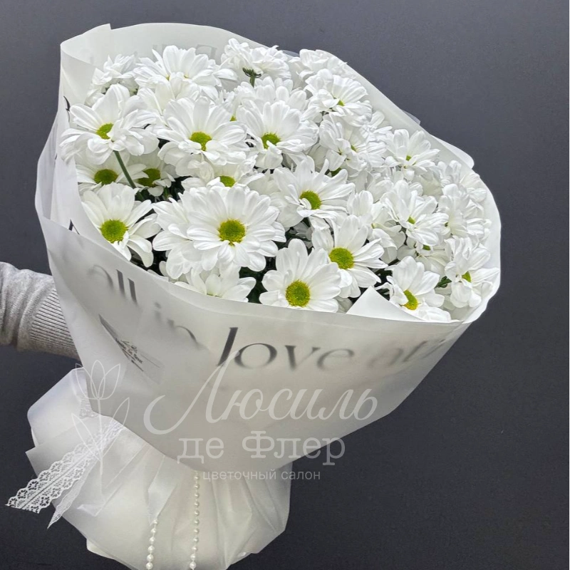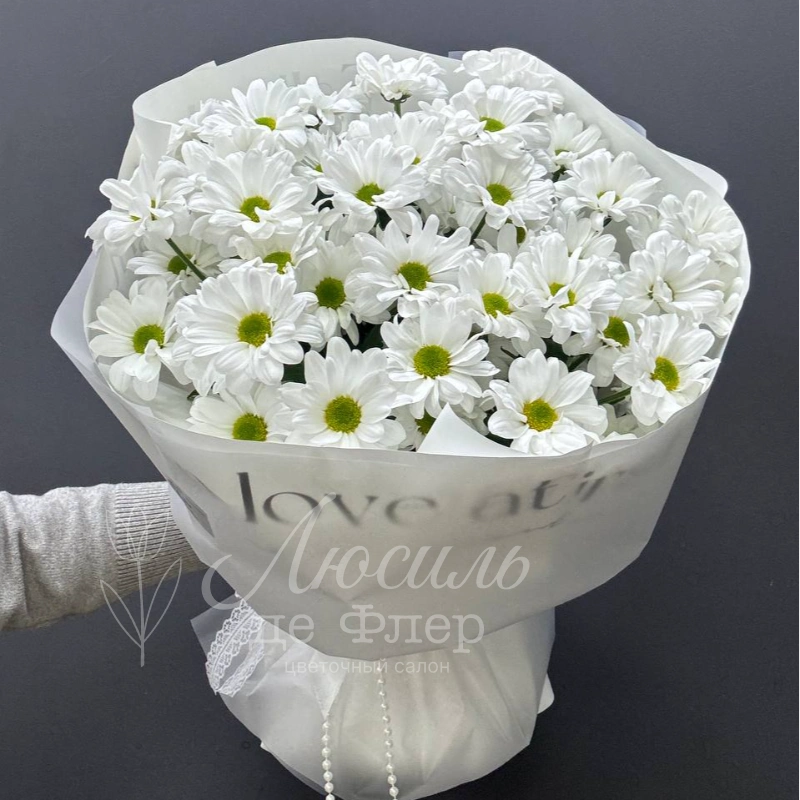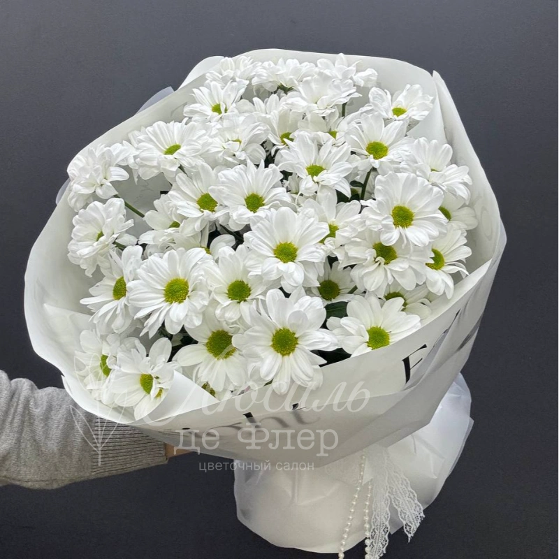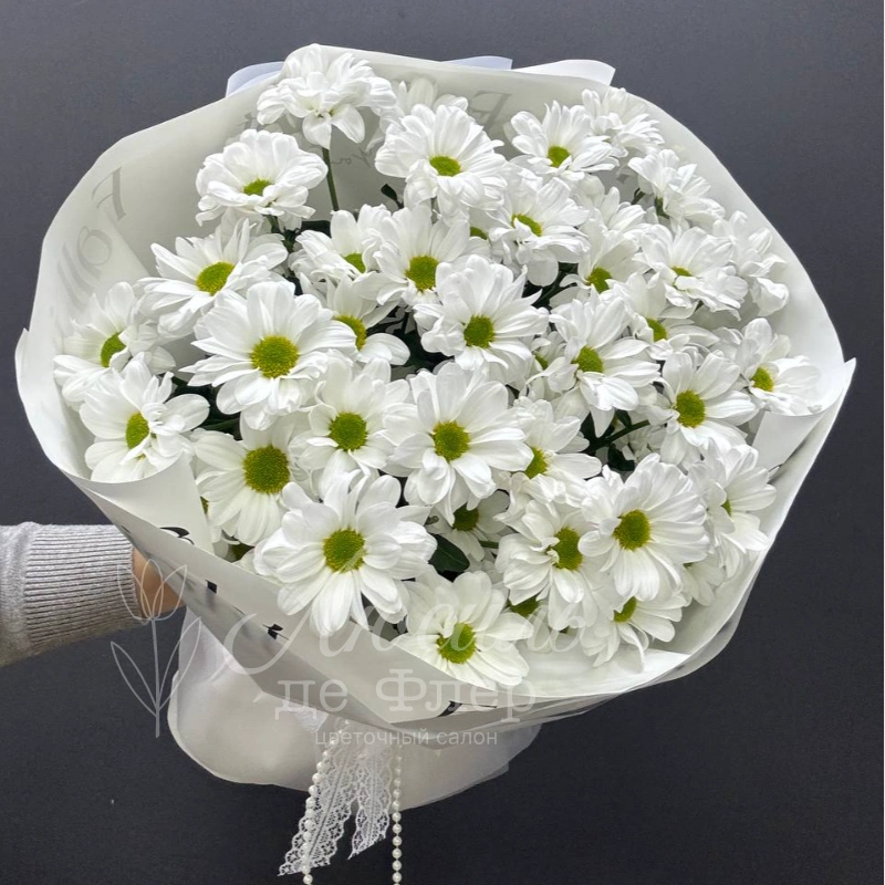 Букет из ромашковых хризантем сорта «Кеннеди». Букет из белых хризантем символ элегантности и чистоты, часто ассоциируемый с невинностью и искренностью. Белые цветы с яркими желто-зелеными сердцевинами создают яркий и жизнерадостный образ, идеально подходящий для выражения светлых чувств и эмоций. Букет из свежесрезанных хризантем, завёрнутый в белую бумагу с декоративным бантом и жемчужной нитью, станет прекрасным подарком для близких или друзей, приносящим радость и вдохновение в любой праздник или просто в обычный день.