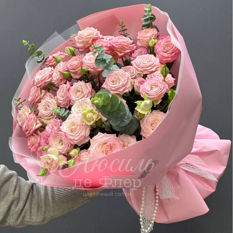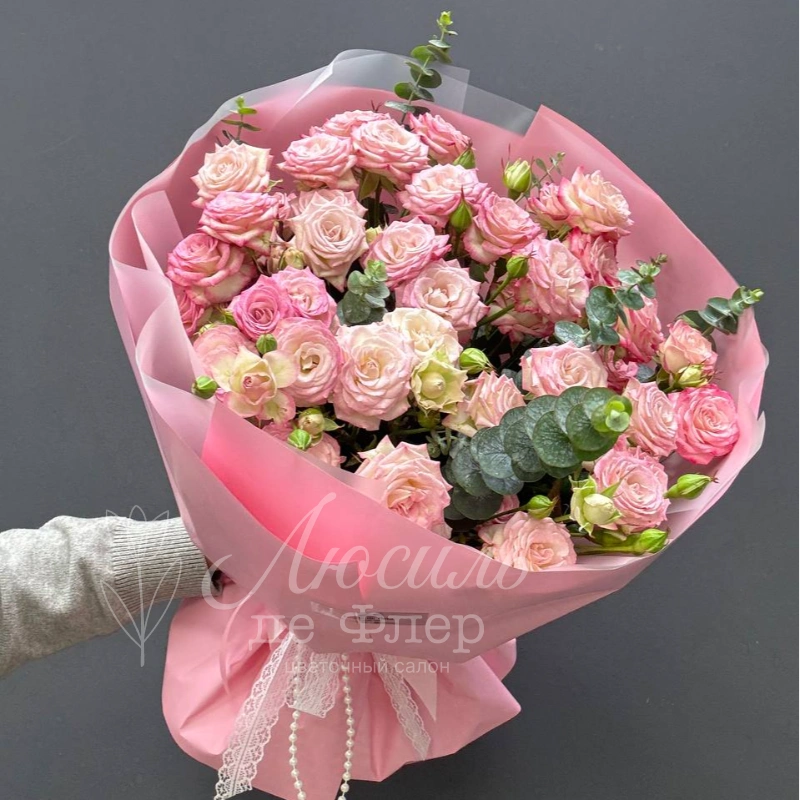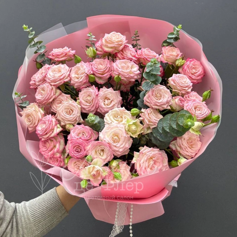 «Нежный букет из кустовых розовых роз «Хейли», завёрнутый в изящную розовую упаковку, создаёт атмосферу утончённой элегантности. Успокаивающие оттенки роз добавляют композиции романтичность и изящество. Этот букет станет прекрасным подарком для тех, кто ценит красоту и нежность.»