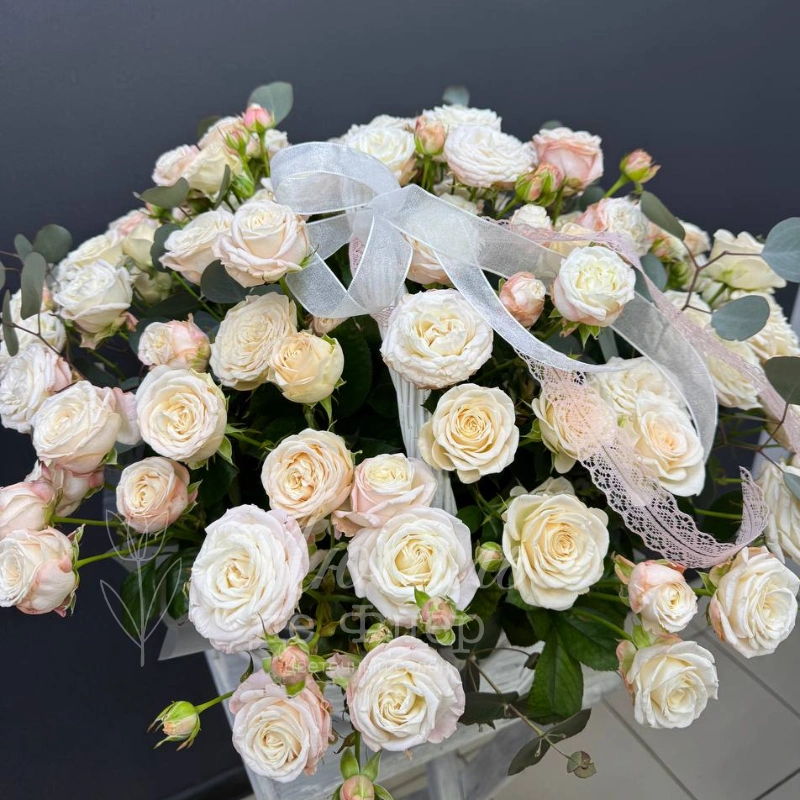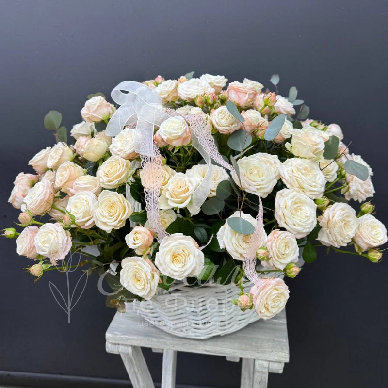 Нежная воздушная композиция в корзине из кремово-розовых кустовых пионовидных роз «Мадам Бомбастик», перевязанный кружевной лентой, создан для того, чтобы выразить самые искренние чувства. Розы в сочетании с зеленью эвкалипта смотрятся воздушно и женственно.
