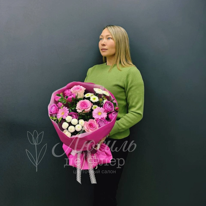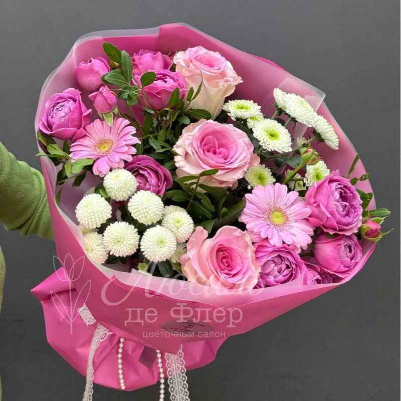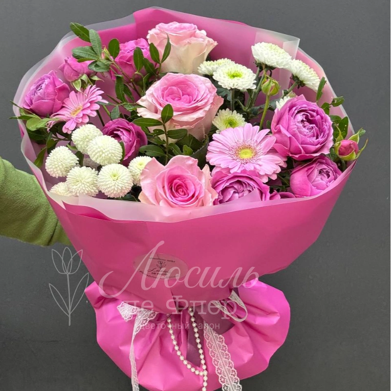 Букет, составленный из розовых роз, малиновых кустовых роз, белых хризантем и нежных гербер, элегантно дополнен декоративными элементами в сдержанной цветовой гамме. Благодаря мягким оттенкам, он выглядит очень женственно и романтично, а также идеально подойдёт для различных церемоний и мероприятий.