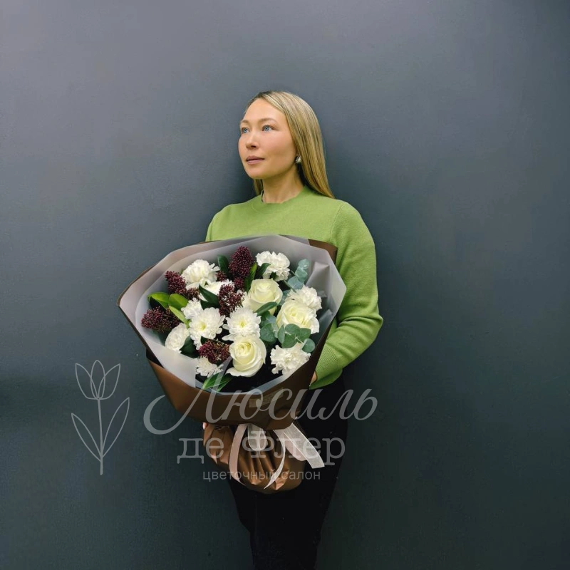 Описание букета для каталога цветов: Нежный, стильный букет из белых роз и диантусов, дополненный изысканными бордовыми соцветиями скимии и свежей зеленью эвкалипта, создаёт атмосферу элегантности и сдержанной роскоши. Композиция, завёрнутая в элегантную упаковку из коричневой бумаги с белыми акцентами, станет идеальным подарком для любого торжества. Сочетание классических цветов и современных акцентов делает букет выразительным и запоминающимся.