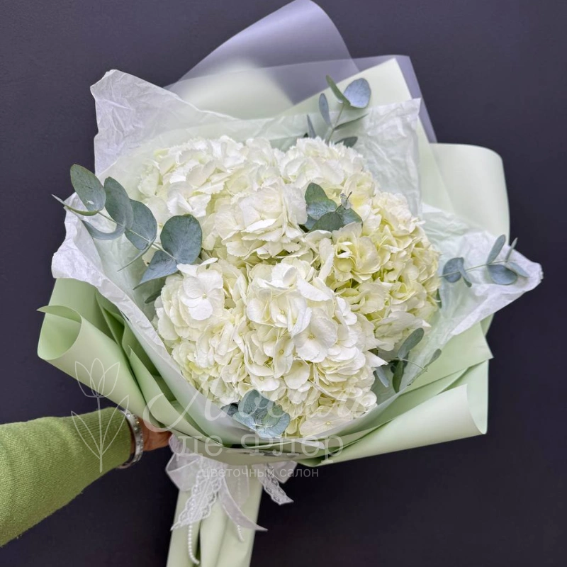 Букет белых гортензий с добавлением эвкалипта, элегантно упакованный в светлую зелёную бумагу и деликатную белую ленту. Нежные цветы и свежий зелёный акцент создают атмосферу лёгкости и чистоты. Идеальный выбор для выражения нежности и изящества в любом поводе.