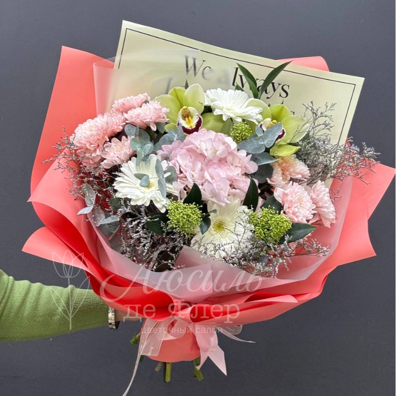 Букет, созданный с нежностью и любовью, представляет собой воздушную композицию из гортензий, орхидей, гербер и хризантем. Нежные оттенки розового и белого цветов создают атмосферу легкости и романтики, а зелень добавляет свежесть и естественность. Этот букет станет прекрасным подарком для самых дорогих и любимых.