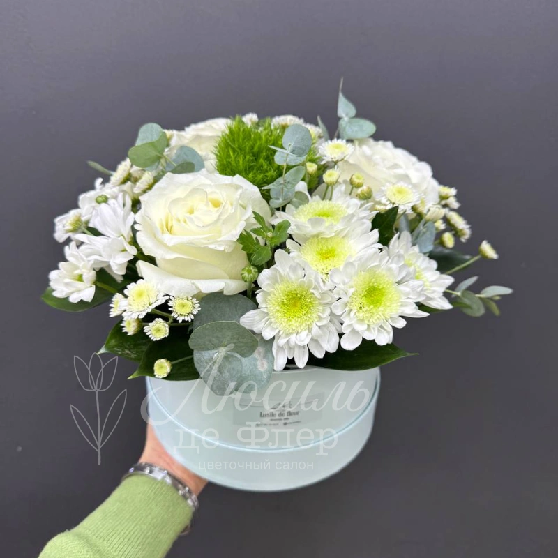 Композиция в шляпной коробке из белых роз, хризантем и эвкалипта «Зефир»