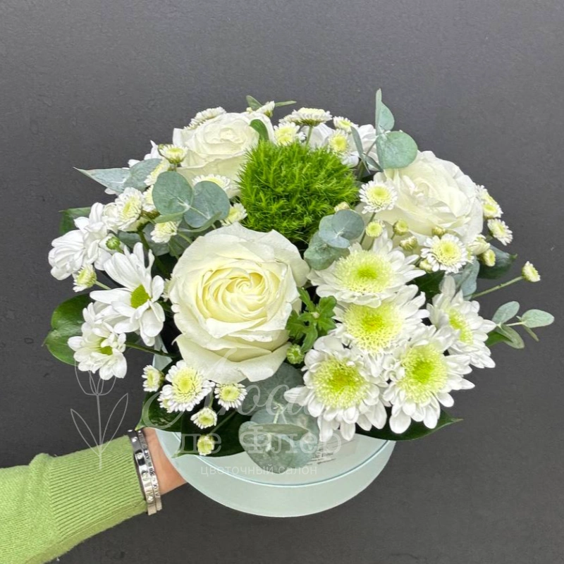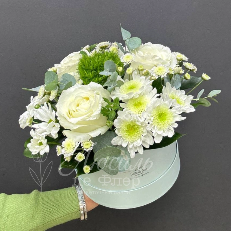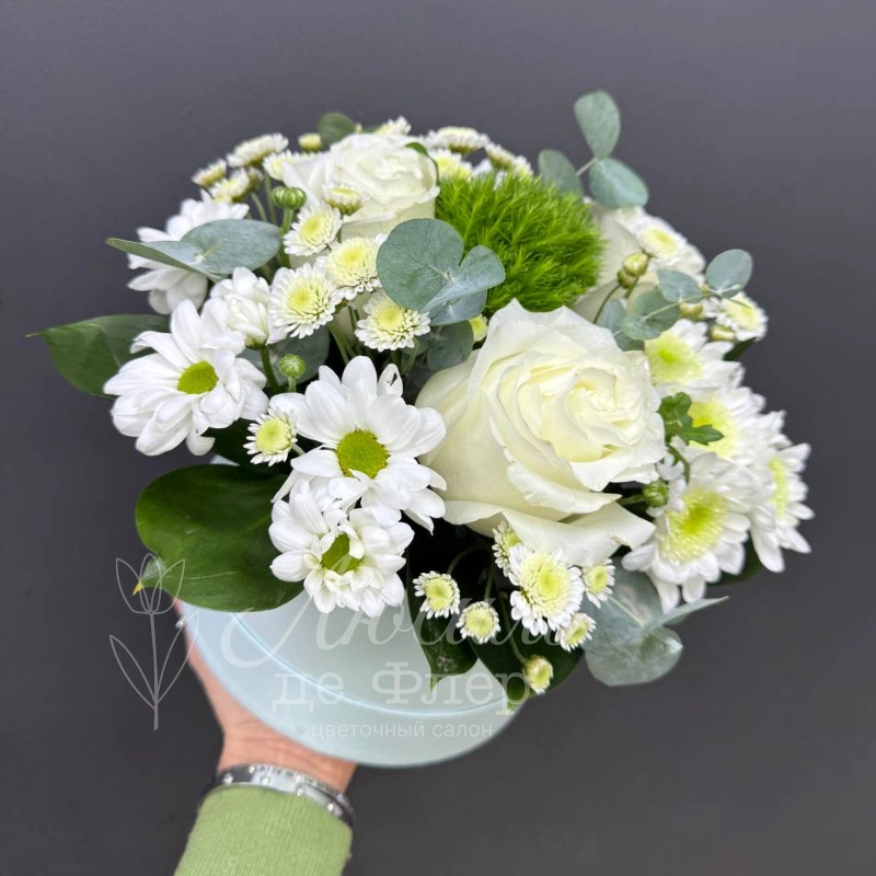 ГлавнаяКаталогКомпозиция в шляпной коробке из белых роз, хризантем и эвкалипта «Зефир»