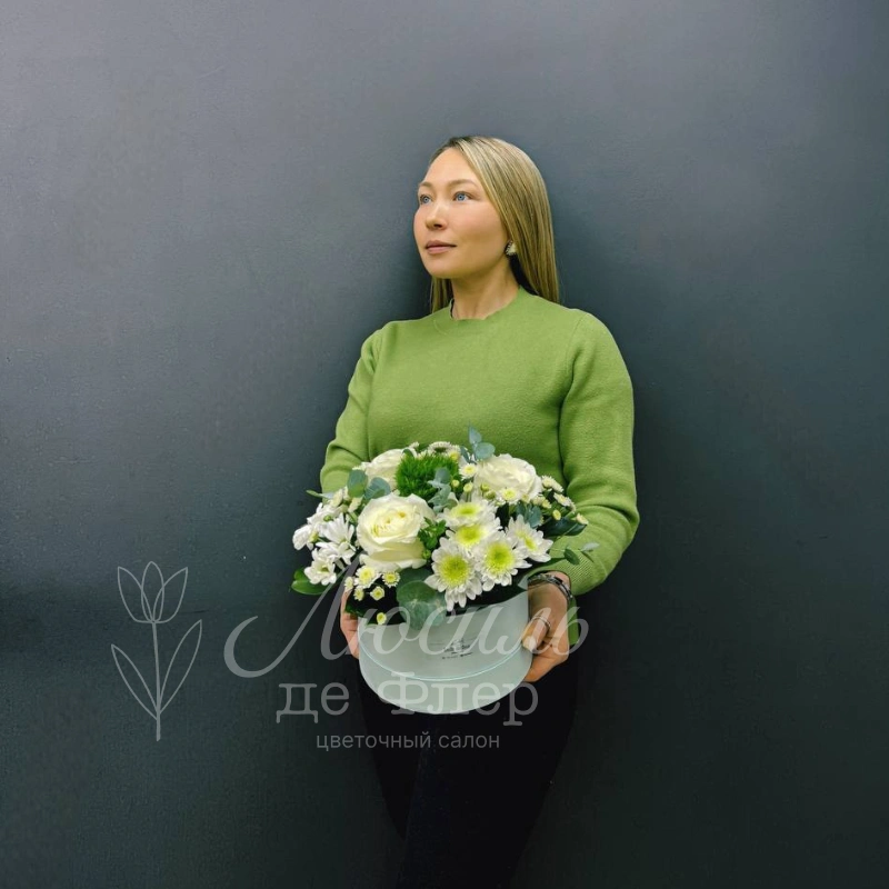 Композиция в шляпной коробке «Зефир" с белоснежными и легкими акцентами зелёного цвета, идеальный для создания романтичной и спокойной атмосферы. Воздушные цветы и свежие листья создают ощущение лёгкости и природной красоты. Этот букет станет прекрасным подарком для любимых или дополнит любой интерьер своей сдержанной элегантностью.»