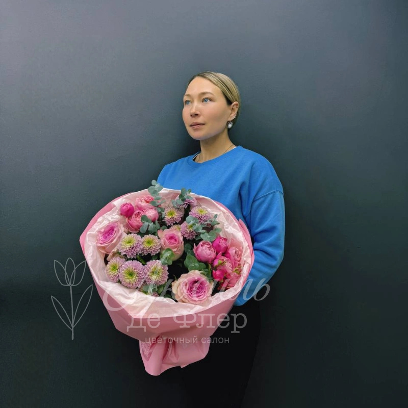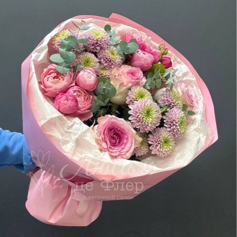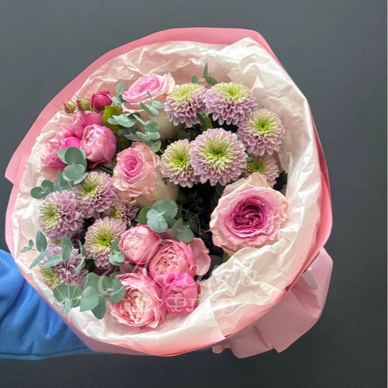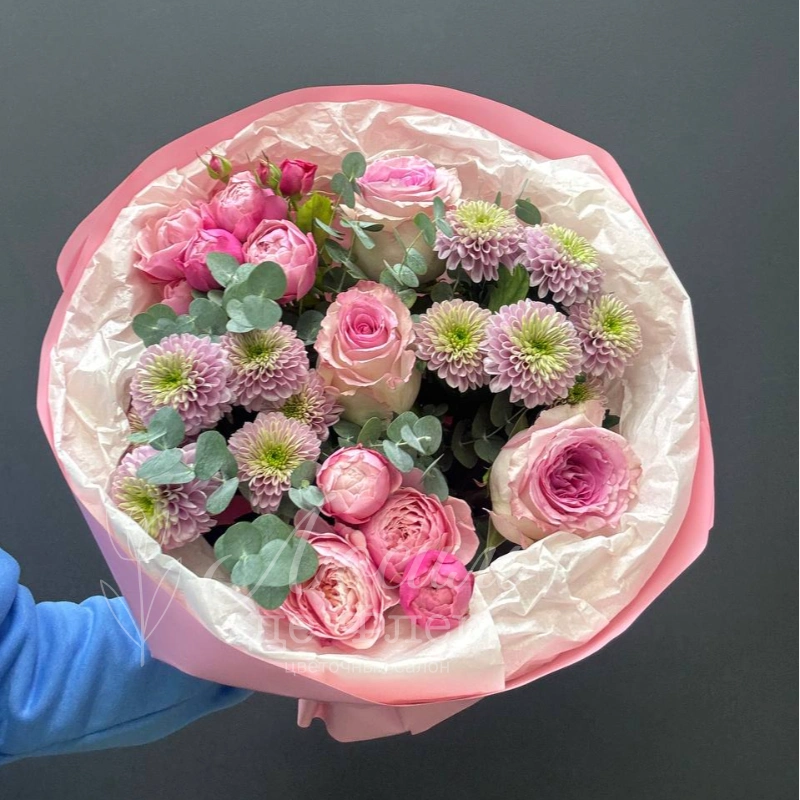 Нежный сборный букет в пастельных тонах, состоящий из розовых роз, кустовых пионовидных роз и пышных хризантем, станет прекрасным подарком для самых близких. Букет красиво упакован в розовую бумагу, подчеркивающую свежесть и элегантность цветов.