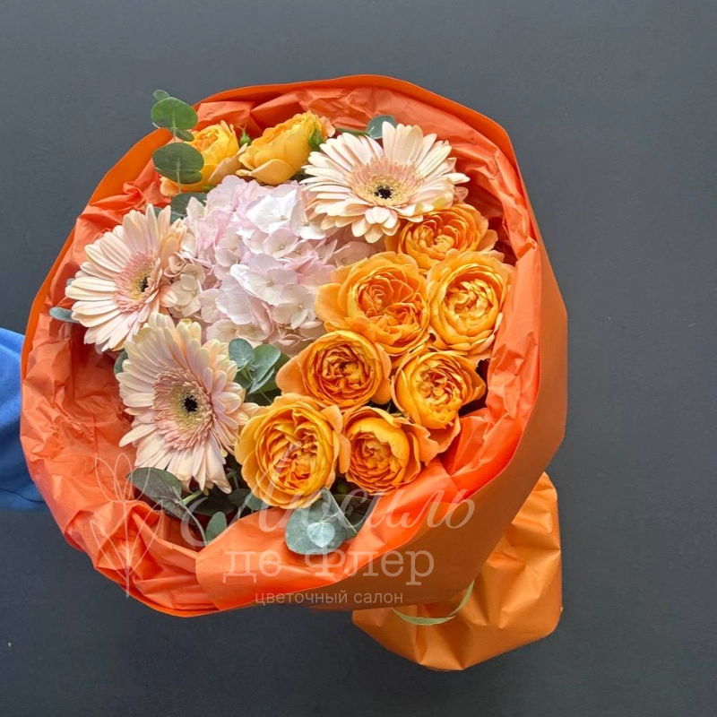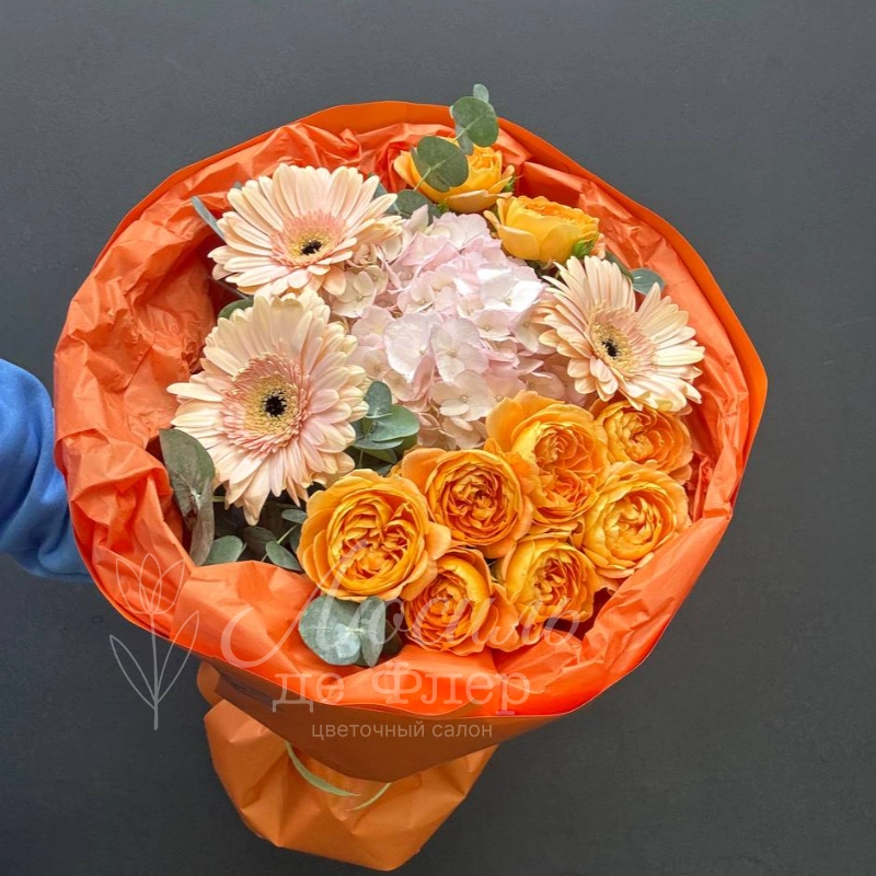 Букет, представленный на изображении, это яркая и солнечная композиция, состоящая из оранжевых роз, персиковых гербер и светлой гортензии. Он прекрасно упакован в оранжевую бумагу, что добавляет ему яркости и игривости. Этот букет станет отличным подарком или дополнит любой интерьер своим теплом и уютом.