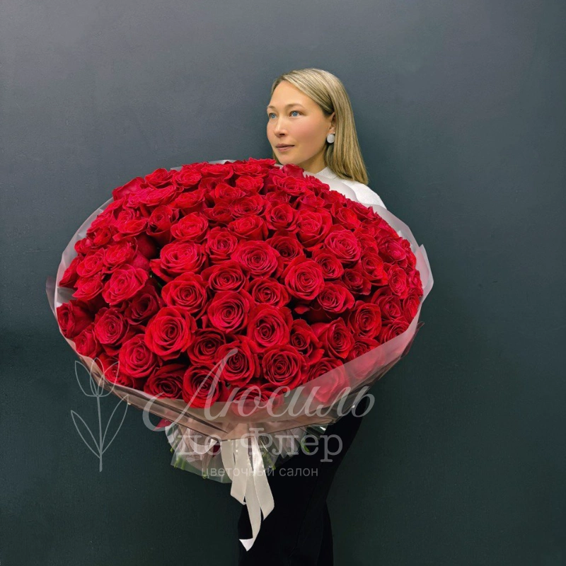 Роскошный букет из 101 ярко-красной розы, элегантно упакованный в прозрачную пленку и перевязанный белой лентой, станет идеальным выражением страстной любви и глубоких чувств. Великолепные, насыщенно-красные бутоны с нежными изгибами лепестков создают насыщенный, интенсивный цвет и наполняют воздух ароматом, делая букет выразительным и запоминающимся подарком.
