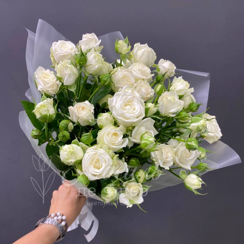 Монобукет из белых кустовых роз , элегантно и сдержанно смотрится, создавая ощущение свежести и чистоты. Нежные оттенки белых роз делают композицию подходящей для различных торжественных случаев. Букет выглядит стильно и гармонично, подчеркивая красоту цветов.