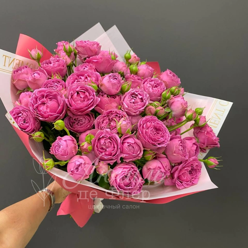 Букет из пионовидных кустовых роз в ярко-розовой гамме, элегантно упакованный в белую и розовую бумагу с бантом, станет прекрасным подарком для любого торжества. Яркие оттенки и свежие цветы создают романтичное и трогательное настроение.