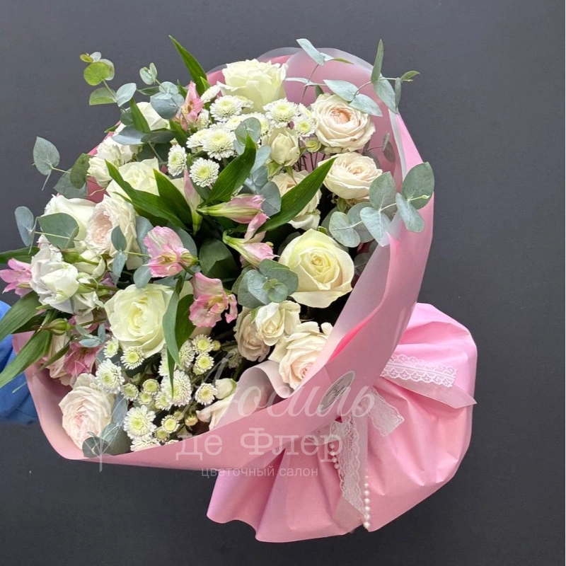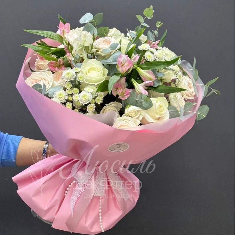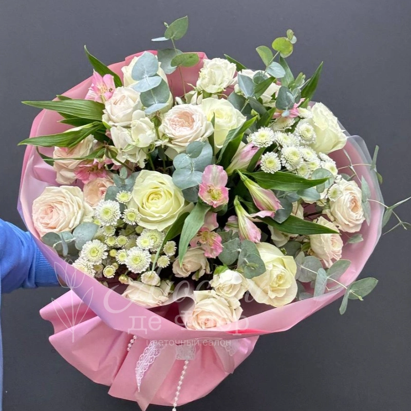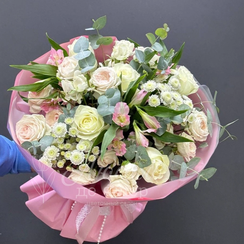 Букет «Очарование» - это изящное сочетание белых и нежно-розовых роз, дополненное свежими зелеными листьями эвкалипта. Нежные оттенки цветов создают атмосферу легкости и романтики, а воздушная упаковка добавляет особую элегантность. Этот букет станет прекрасным подарком для любимых и близкий.
