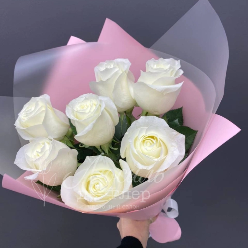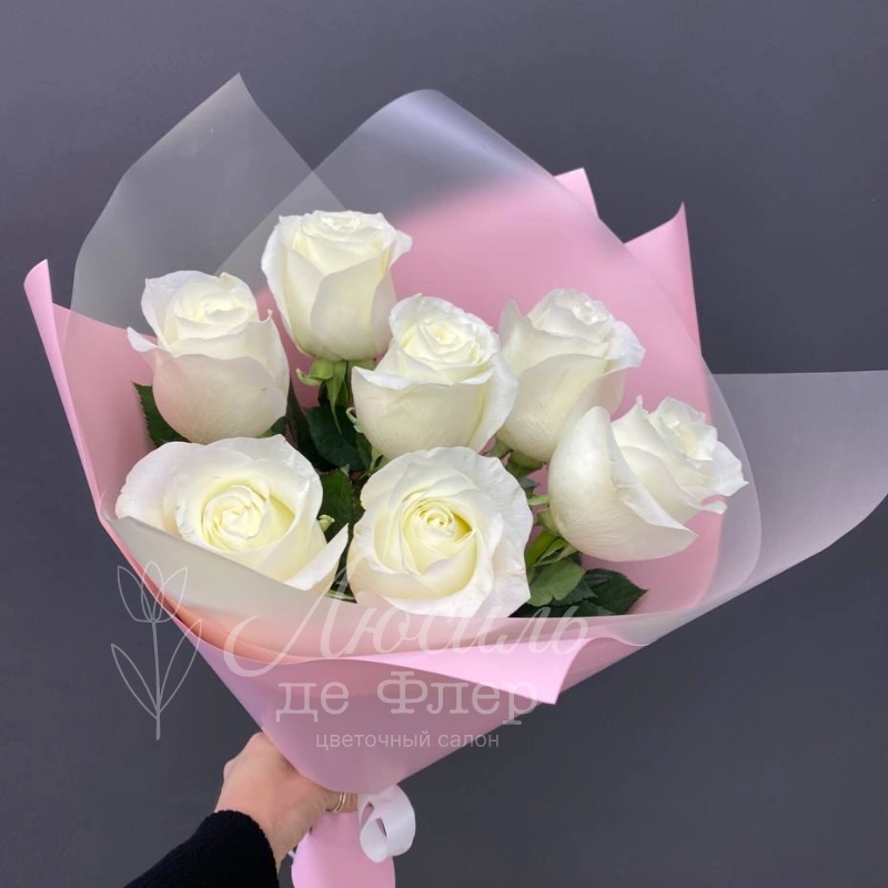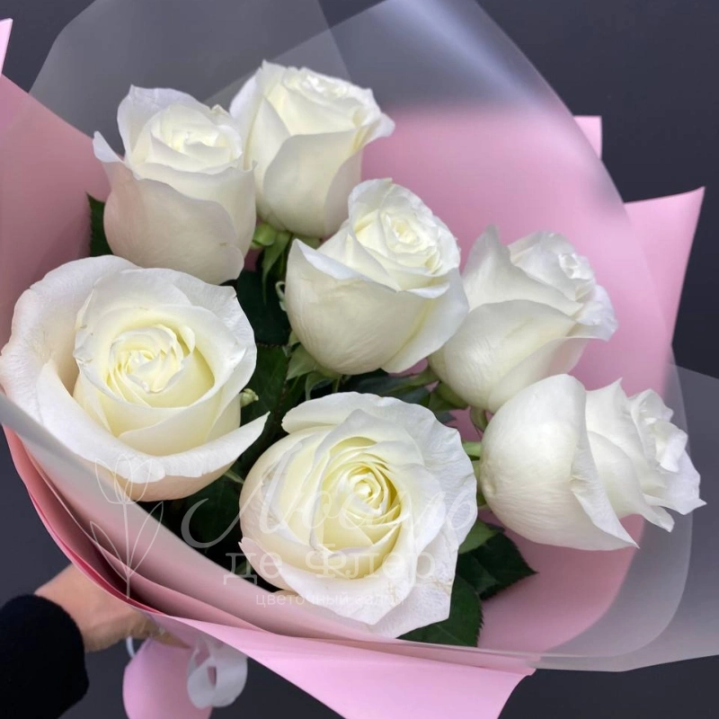 Букет из семи белых роз, элегантно упакованный в розовую бумагу, создаёт впечатление воздушности и нежности. Белые розы символизируют чистоту и романтику, делая этот букет идеальным выбором для выражения глубоких чувств. Лаконичная, но впечатляющая композиция подчёркивает красоту и благородство цветов.