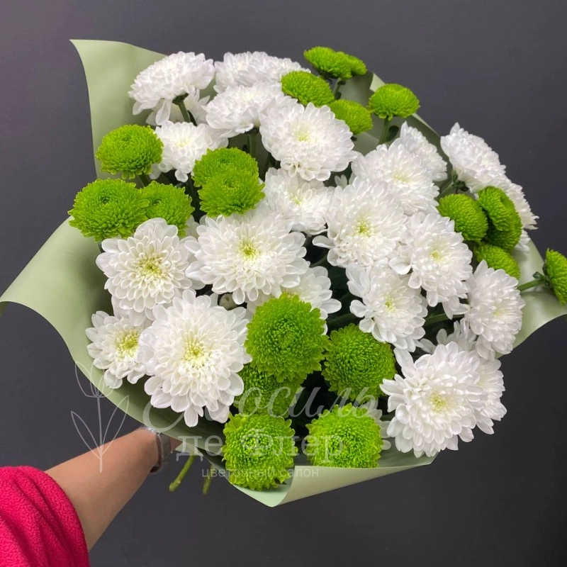 Букет, в котором белые хризантемы с воздушными соцветиями дополнены яркими зелёными акцентами, создавая свежий и элегантный образ. Композиция идеально подойдёт для тех, кто ценит сдержанную красоту и оригинальность. Хризантемы в нежных белых и сочных зелёных оттенках, собранные в гармоничную композицию, излучают свежесть и лёгкость, наполняя пространство нежностью и уютом.