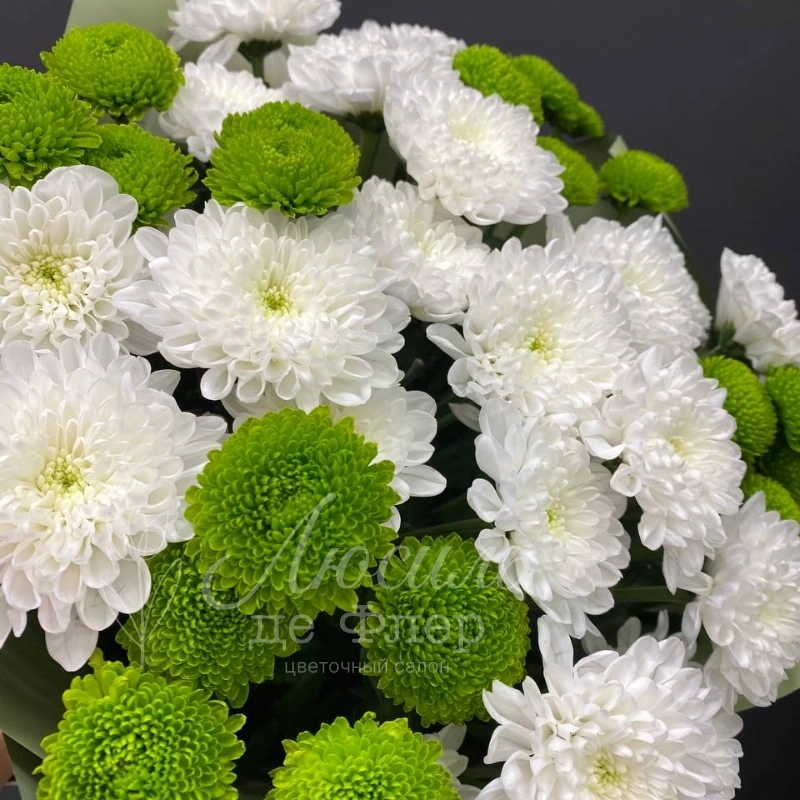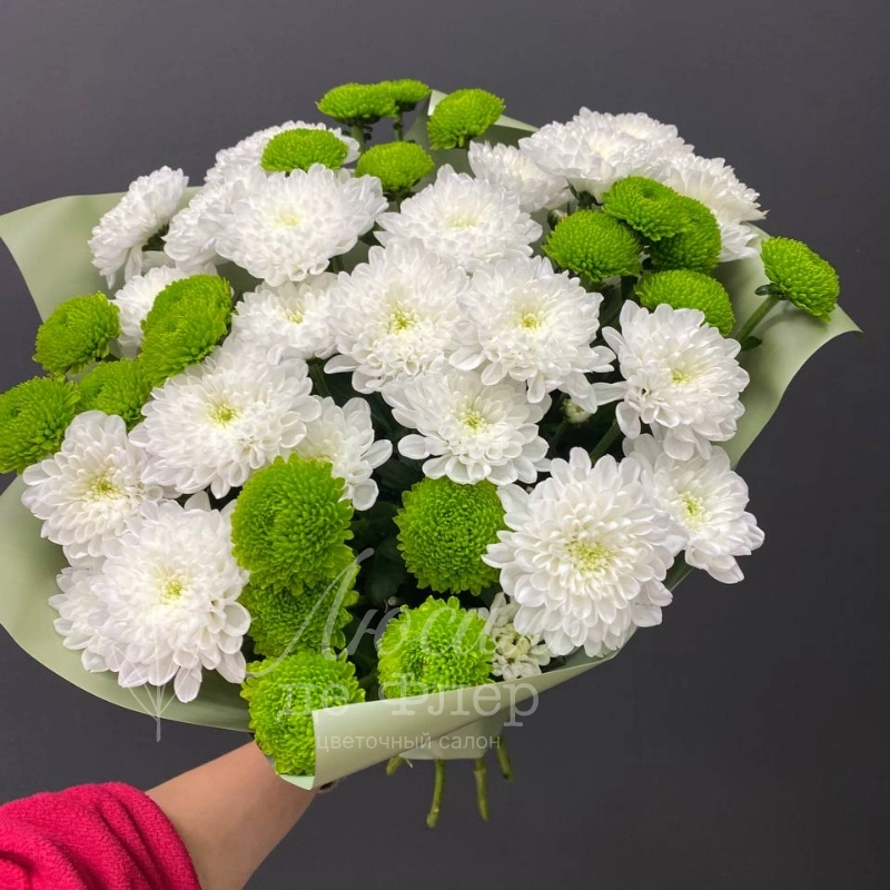 Букет, в котором белые хризантемы с воздушными соцветиями дополнены яркими зелёными акцентами, создавая свежий и элегантный образ. Композиция идеально подойдёт для тех, кто ценит сдержанную красоту и оригинальность. Хризантемы в нежных белых и сочных зелёных оттенках, собранные в гармоничную композицию, излучают свежесть и лёгкость, наполняя пространство нежностью и уютом.